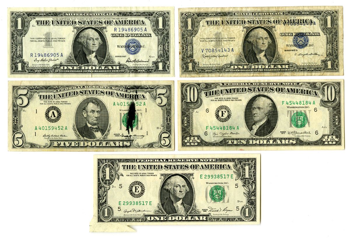 Various States, 1957-81. Lot of 5 Issued Error Banknotes, Includes: Silver Certificate $1, Series 1957, Fr.# 1619, with Gutter fold; $1, Series 1957B, Fr.# 1621, with Misaligned Overprint; Federal Reserve Notes, $5, Series 1969, Fr.# 1969A with Ink Smear; $10, Series 1977, Fr.# 2023F with Offset Printing Error; $1, Series 1981, Fr.# 1911E with Extra Selvage. Notes range from XF to AU condition. (5). Sold "AS IS" no returns accepted.