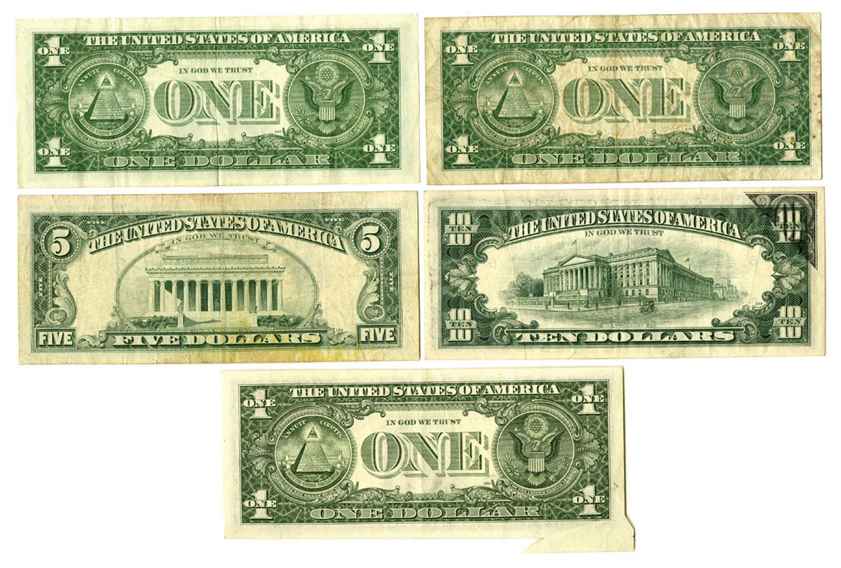 Various States, 1957-81. Lot of 5 Issued Error Banknotes, Includes: Silver Certificate $1, Series 1957, Fr.# 1619, with Gutter fold; $1, Series 1957B, Fr.# 1621, with Misaligned Overprint; Federal Reserve Notes, $5, Series 1969, Fr.# 1969A with Ink Smear; $10, Series 1977, Fr.# 2023F with Offset Printing Error; $1, Series 1981, Fr.# 1911E with Extra Selvage. Notes range from XF to AU condition. (5). Sold "AS IS" no returns accepted.