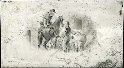 ca.1850's-70's. 114x64x3mm steel die, image of horse-rider speaking with farmer accompanied by dog, couple of chickens and cow, with barn and village (showing church) in background, die "V 49157", "N.B.N. Co." imprint. Accompanied by print of the die affixed on filing envelope. XF condition. Unique in archive. NBNC