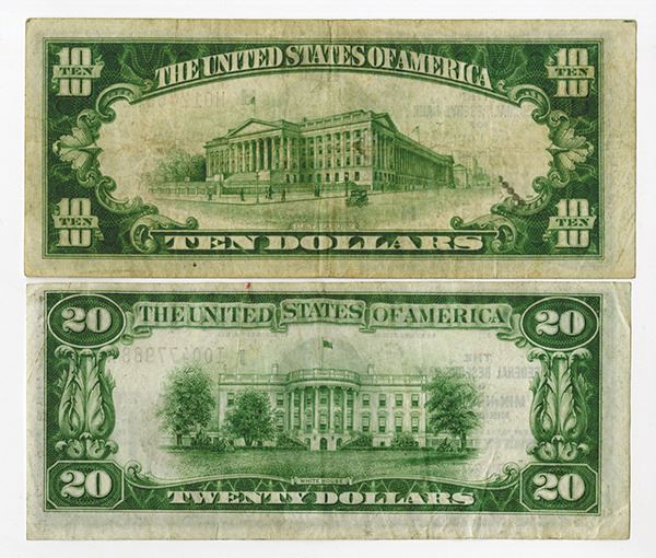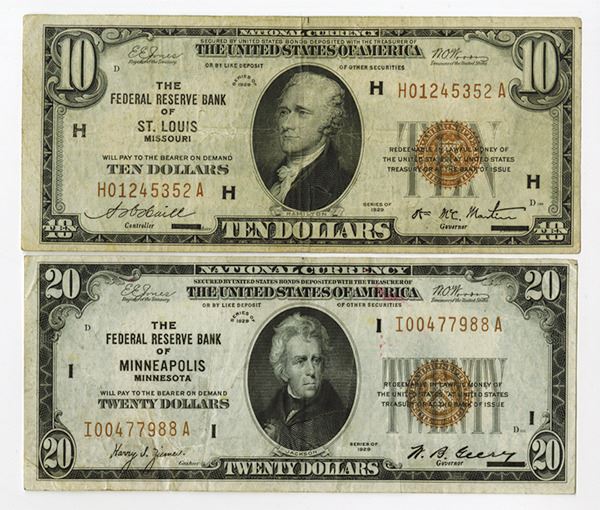 Washington, D.C., lot includes from the Federal Reserve Bank of Minneapolis Minnesota, $20, Series 1929, Fr#1870-I, Very Fine; and from the Federal Reserve Bank of St. Louis Missouri, $10, Series 1929, Fr#1860-H, About Very Fine.