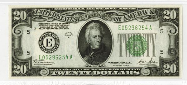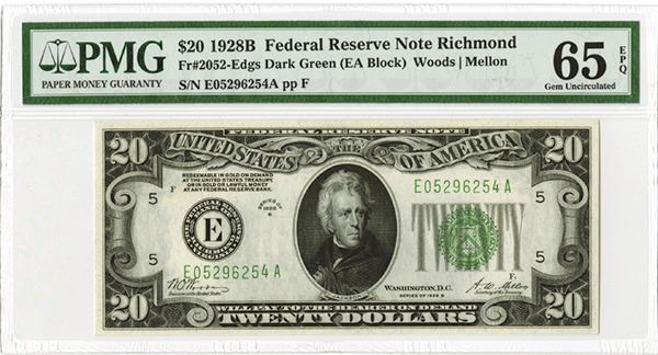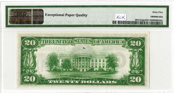 Washington, D.C., $20, Issued, Woods | Mellon signatures, S/N E05296254A, PMG graded Gem Uncirculated 65 EPQ.