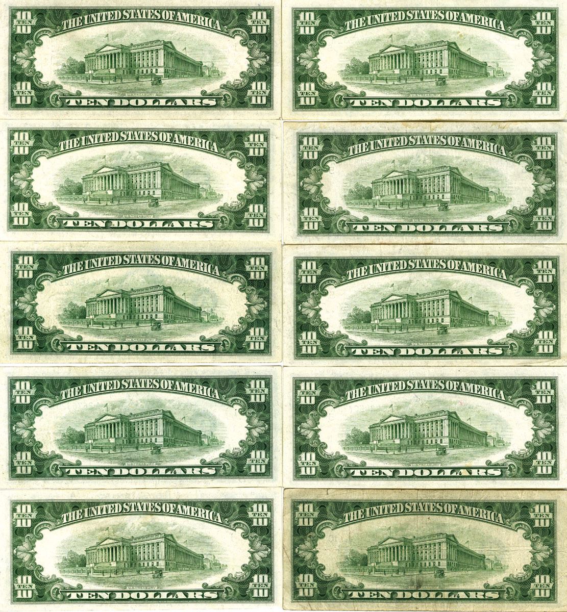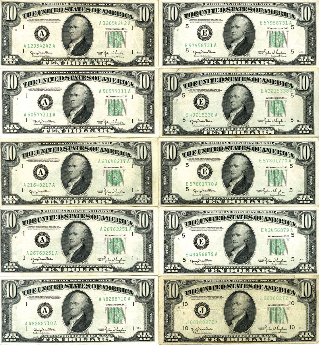 Various States, 1950. Lot of 10 $10, Series of 1950, Issued Banknotes and Replacement/Star Notes from Boston MA, Fr.# 2010A (5); Richmond VA, Fr.# 2010E (4); Kansas City MO, Fr.# 2010J*. All have Clark | Snyder Signatures and Green seal at right, Notes range from Choice Fine to XF condition. (10).