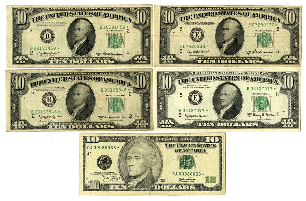 Various States, 1950 to 2003. Lot of 5 Issued Replacement or Star Notes, Includes: $10, P-439b (2), Series of 1950B, Fr.# 2012B*; $10, P-439d, Series of 1950D, Fr.# 2014B*; $10, P-445b, Series of 1963A, Fr.# 2017E*; $10, P-518, Series of 2003, Fr.# 2037A*. Notes range from Choice Fine to XF condition. (5). Sold "AS IS" no returns accepted.