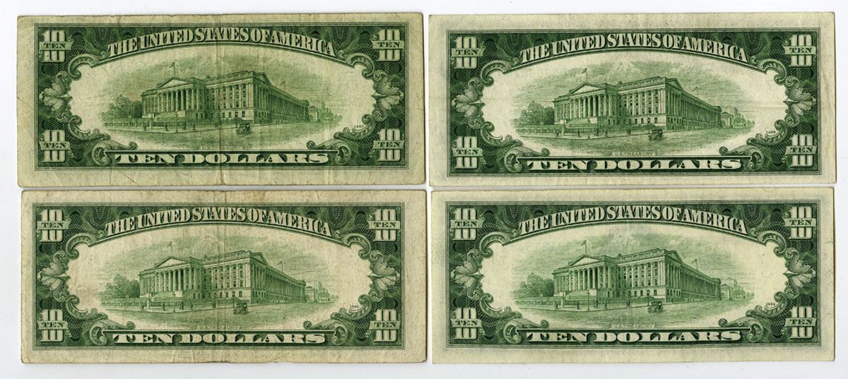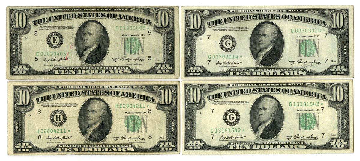 Various States, 1950. Lot of 4 $10, Series of 1950A, Issued Replacement or Star Notes from Richmond VA, Fr.# 2011E*; Chicago IL, Fr.# 2011G* (2); St. Louis MO, Fr.# 2011H*. All have Priest | Humphrey Signatures and Green seal at right, Notes range from Choice Fine to XF condition. (4).