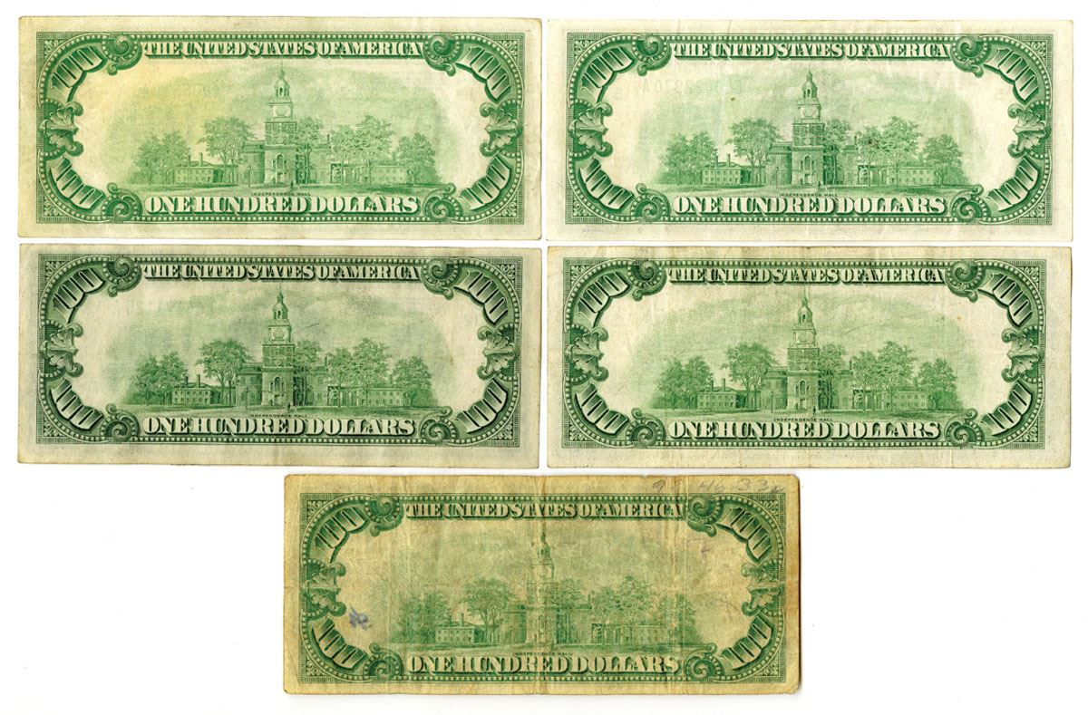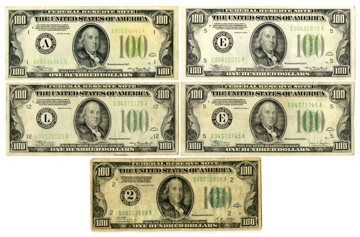 Various States, 1928 to 1934. Lot of 5 $100 Federal Reserve Notes, Includes: Series of 1928, New York NY, $100 Fr.# 2150B, Woods | Mellon Signatures; Series of 1934, Boston MA, $100 Fr.# 2152A, Julian | Morgenthau Signatures; Richmond VA, $100 Fr.# 2152E, Julian | Morgenthau Signatures; San Francisco CA, $100 Fr.# 2152L, Julian | Morgenthau Signatures; Series of 1934C, Richmond VA, $100 Fr.# 2155E, Julian | Snyder Signatures. Notes range from VF to Choice XF condition. (U.S. Face Value is $500), (5).