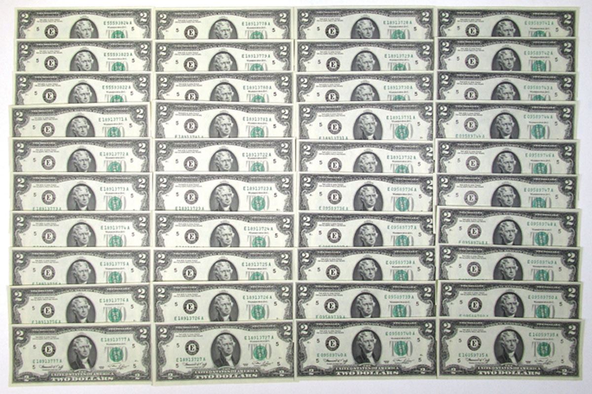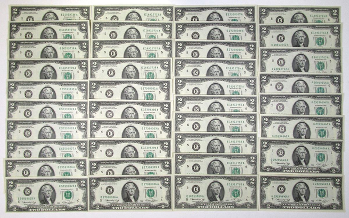 Richmond, Virginia, 1976. $2 Series 1976, P-461 (78) Fr.# 1935E, Issued Banknote Collection, Black printing with Thomas Jefferson at center and green seal at right, Back is green with 'Signing of the Declaration of Independence' by Trumbull at center, Neff | Simon Signatures, Notes range from UNC to CU condition. Includes partially sequential groups. (78). Sold "AS IS" no returns accepted.
