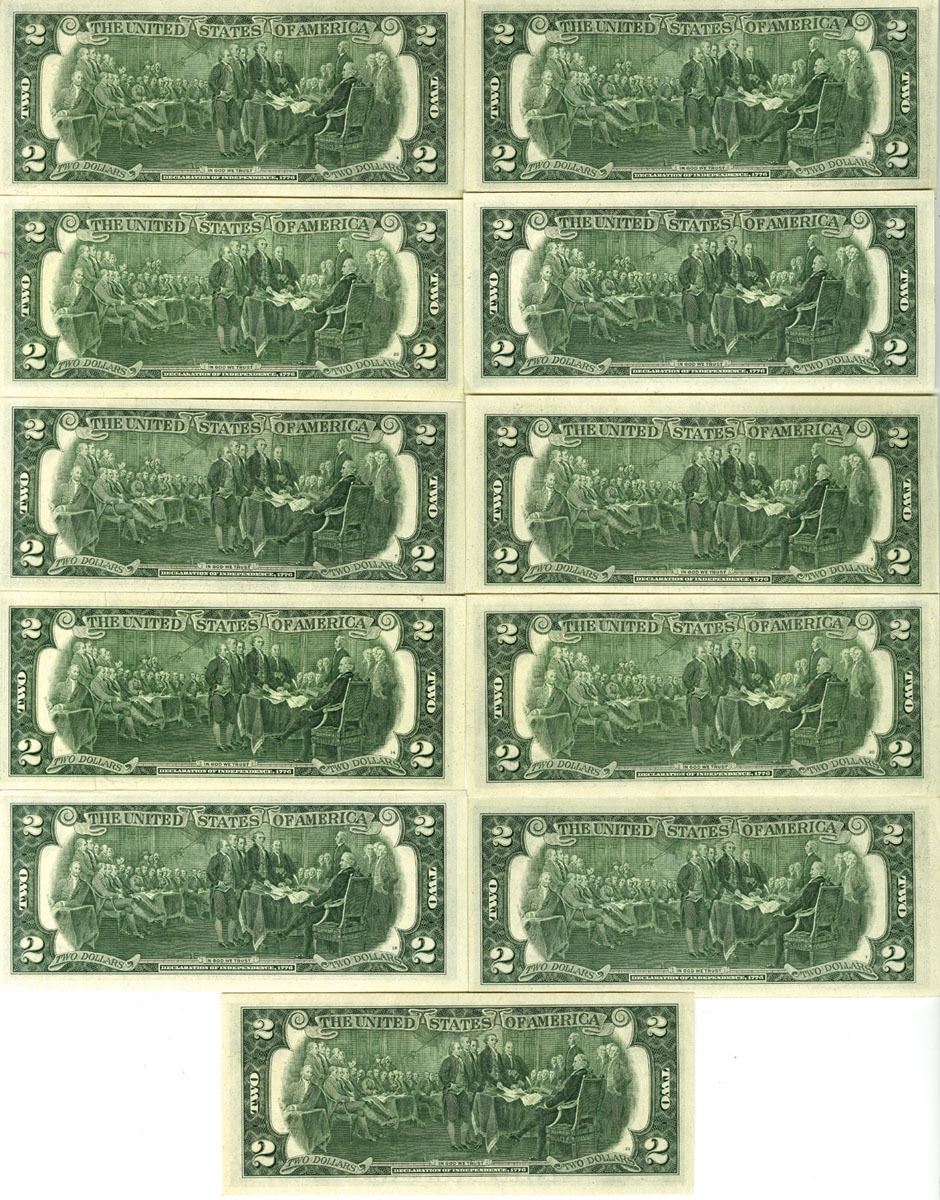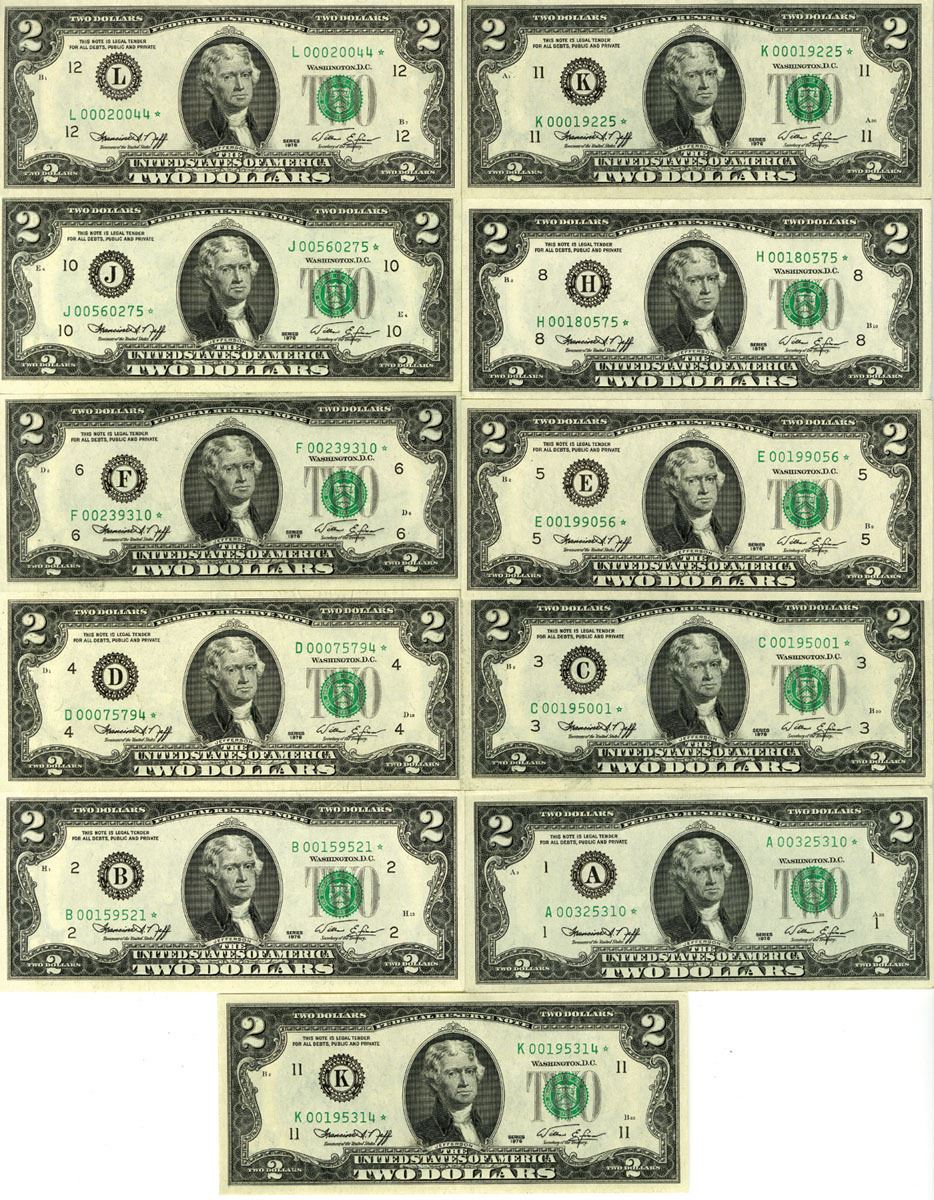 Various States, Lot of 11 Replacement notes, with 10 out of the 12 different districts, Includes 1976. $2, P-461*, Series of 1976, all Replacement notes from 10 out of the 12 different Federal Reserve Districts. The districts include San Francisco, California; Dallas, Texas (2); Kansas City, Missouri; St. Louis, Missouri; Atlanta, Georgia; Richmond, Virginia; Cleveland, Ohio; Philadelphia, Pennsylvania; New York, New York; and, Boston, Massachusetts. All have low S/Ns starting with at least "00", Choice to Gem Uncirculated or better condition. (11). Sold "AS IS" no returns accepted.