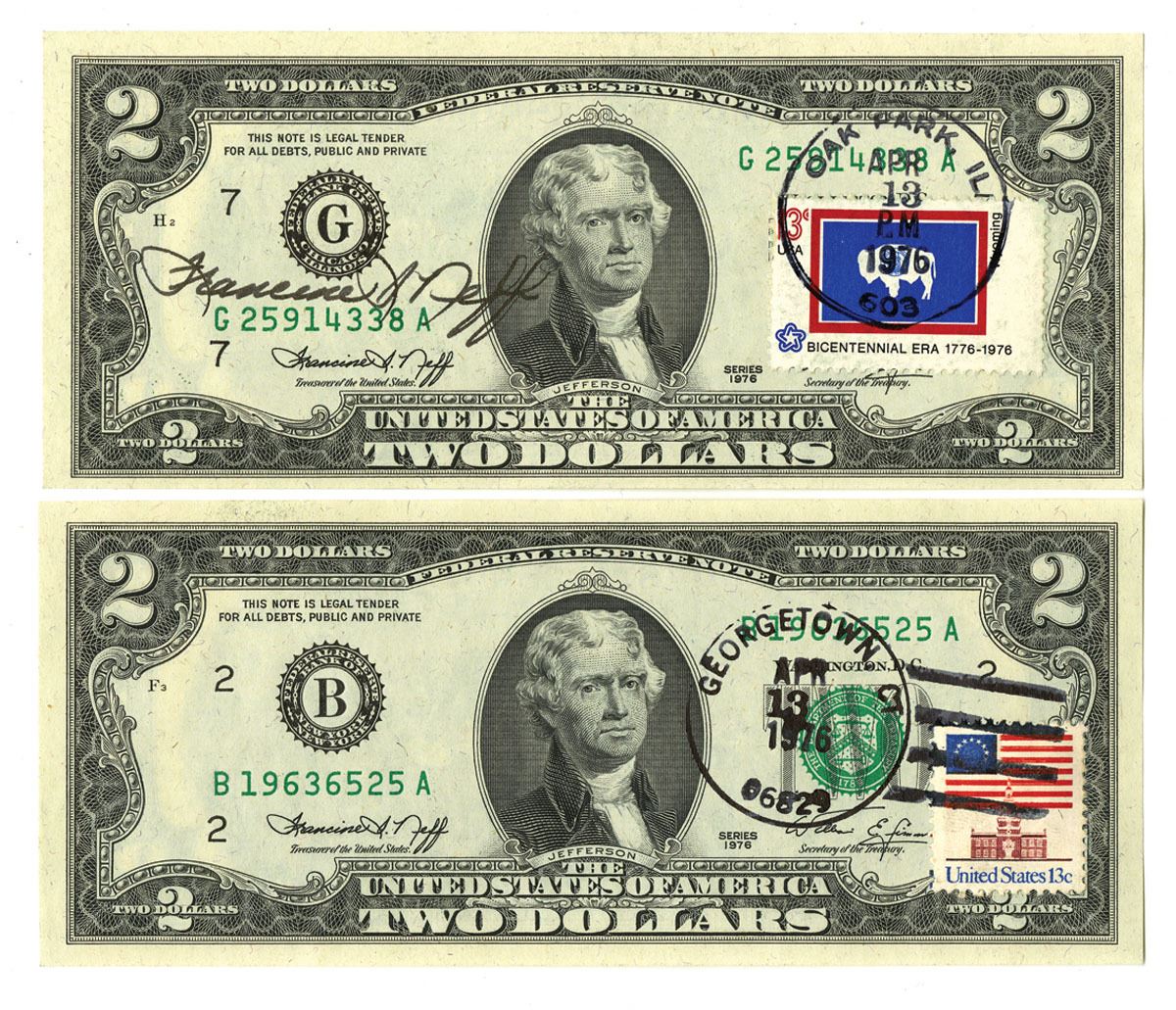 Illinois & New York, 1976. Lot of 2 Issued Banknotes, Includes: Chicago, Illinois, $2, P-461, Fr.# 1935-G, Neff | Simon Signatures and Neff autograph above printed signature, First day stamp cancelled - Oak Park, IL; New York, New York, $2, P-461, Fr.# 1935-B, Neff | Simon Signatures, First day stamp cancelled - Georgetown, CT. Notes range from AU to Gem Unc condition. (2). Sold "AS IS" no returns accepted.