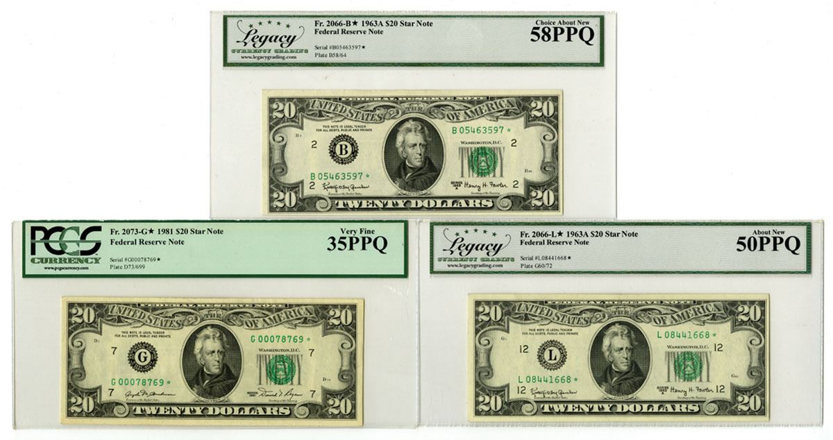 1963 to 1981. Lot of 3 Federal Reserve Star Notes, Includes: New York, NY, $20, Series 1963A, Fr.# 2066-B*, S/N B05463597 pp B58/64, Legacy graded Choice About New 58PPQ; San Francisco, CA, $20, Series 1963A, Fr.# 2066-L*, S/N L08441668* pp G60/72, Legacy graded About New 50PPQ; Chicago, IL, $20, Series 1981, Fr.# 2073-G*, S/N G00078769* pp D73/699, PCGS graded Very Fine 35PPQ. (3). Sold "AS IS" no returns accepted.