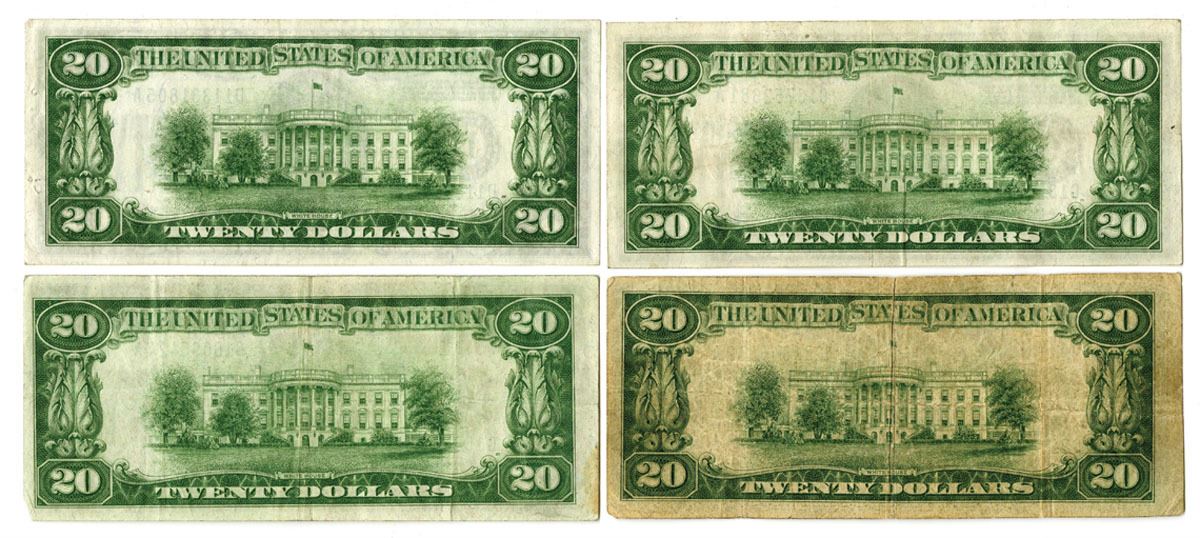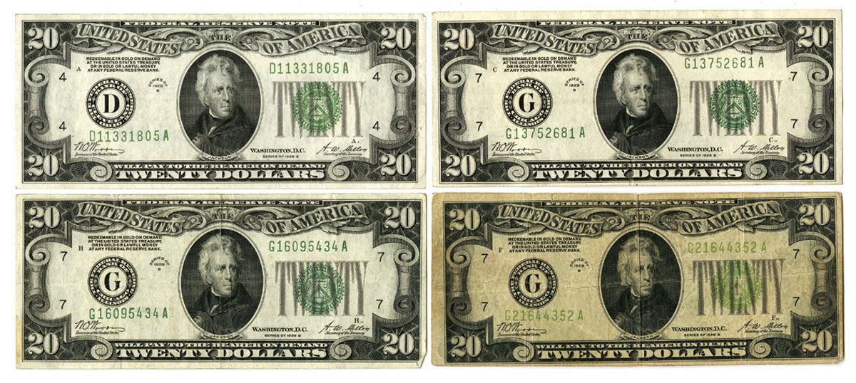 Various States, 1928. Cleveland OH, $20, Series of 1928B, Fr.# 2052D (1 note in Choice VF or better; and, Chicago IL, $20, Series of 1928B, Fr.# 2052G (3). Notes have Green seal at right and Woods | Mellon signatures, Notes range from Choice Fine to Choice VF condition. (4).