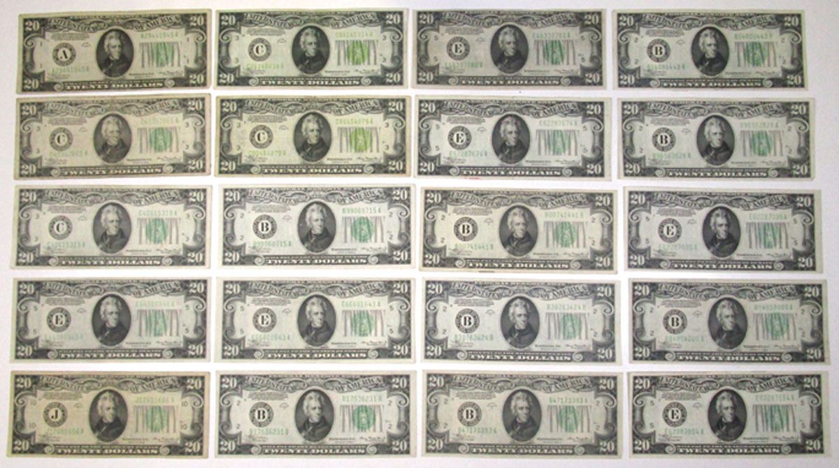 Various States, 1934. Lot of 20 Issued Federal Reserve Notes, Includes: $20, Series of 1934, Fr.# 2054 (7) and $20, Series of 1934A, Fr.# 2055 (13). Notes all have Green seals at right, Julian | Morgenthau signatures, and range from VF to AU condition. (U.S. Face Value is $400), (20).