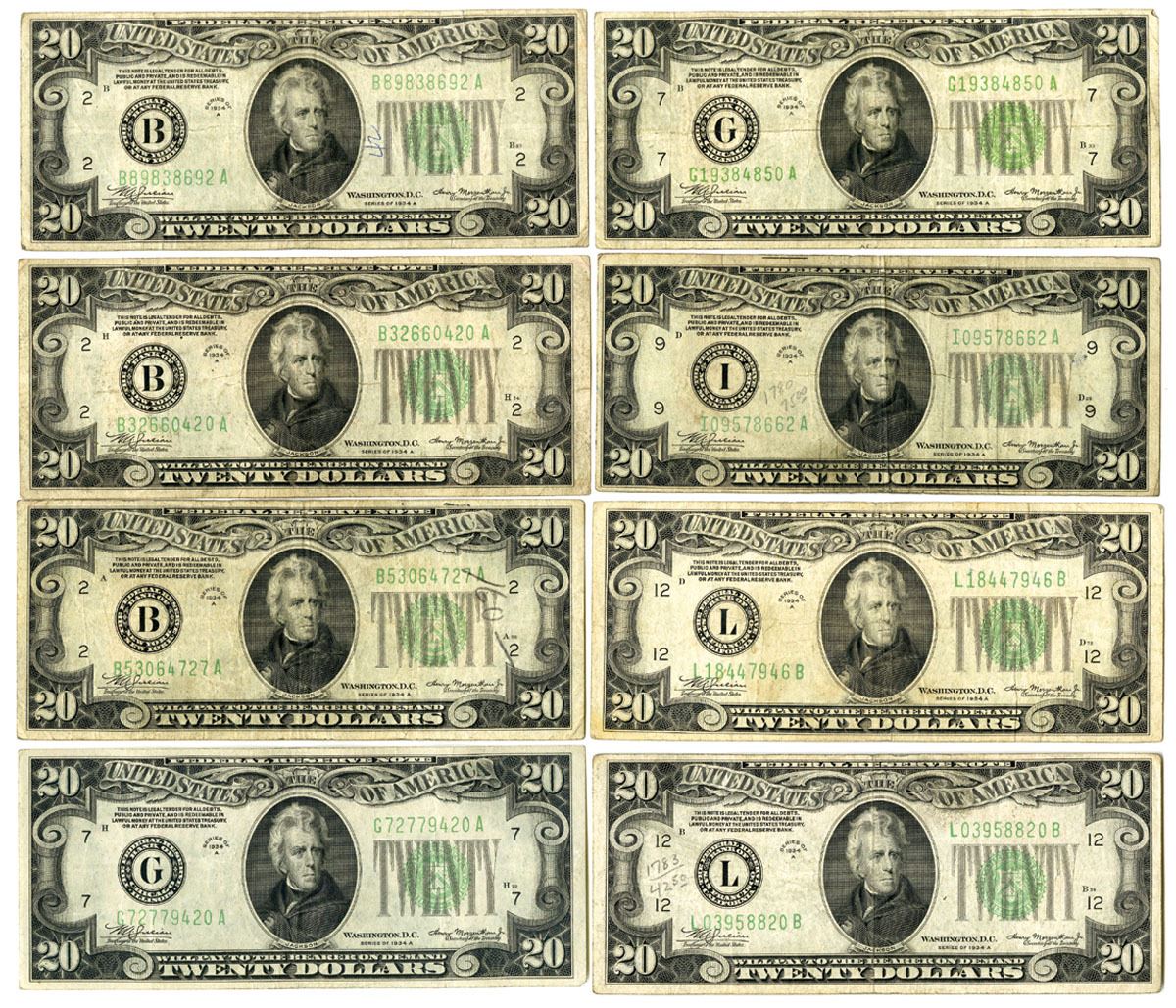 Various States, 1934. Lot of 8, $20 Series of 1934A Banknotes from Various Districts, Includes: New York, NY, Fr.# 2055B (3); Chicago, IL, Fr.# 2055G (2); Minneapolis, MN, Fr.# 2055I; San Francisco, CA, Fr.# 2055L (2). All have Julian | Morgenthau Signatures and Green seal at right, Notes range from VF to Choice VF condition. (8).