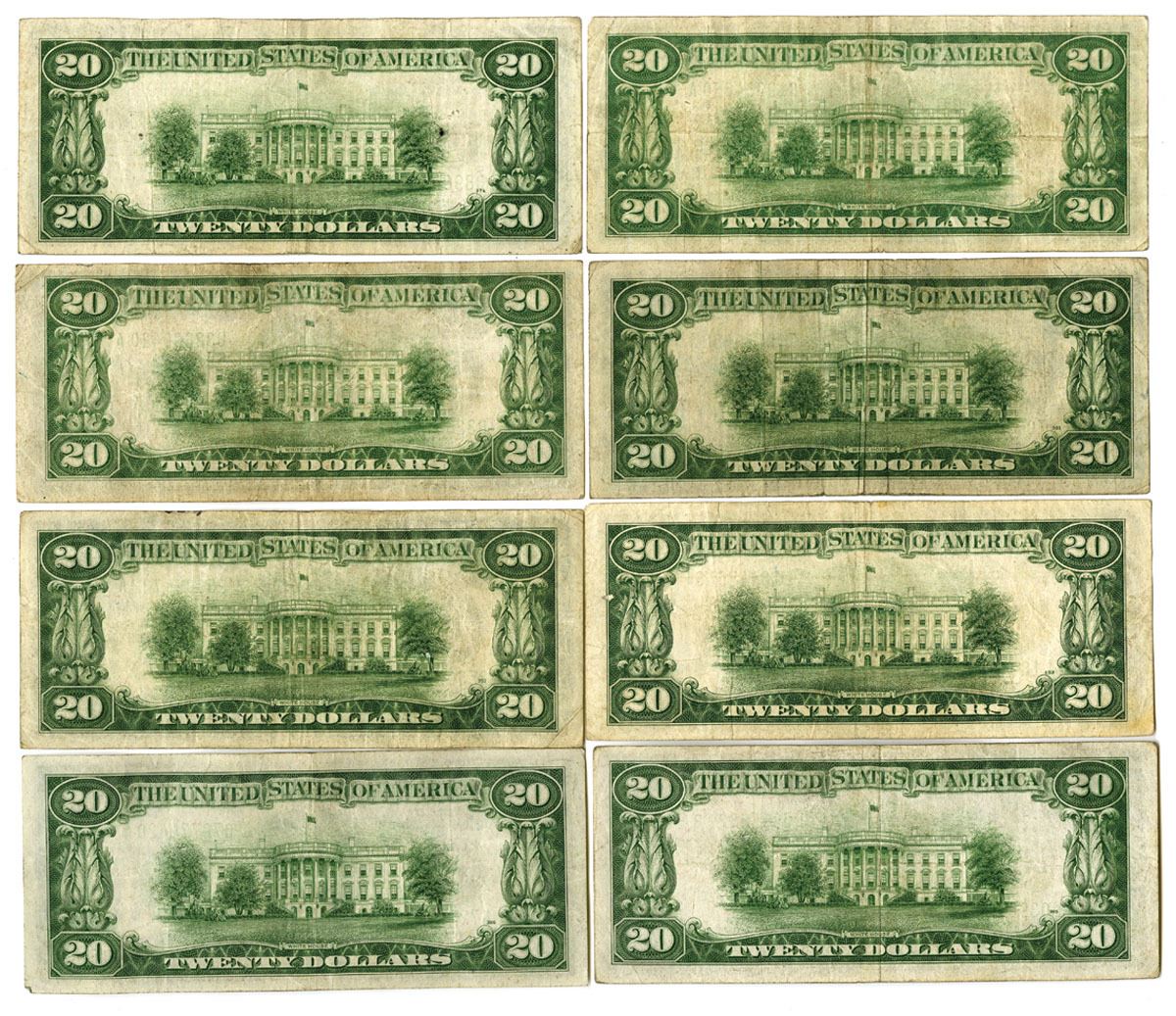 Various States, 1934. Lot of 8, $20 Series of 1934A Banknotes from Various Districts, Includes: New York, NY, Fr.# 2055B (3); Chicago, IL, Fr.# 2055G (2); Minneapolis, MN, Fr.# 2055I; San Francisco, CA, Fr.# 2055L (2). All have Julian | Morgenthau Signatures and Green seal at right, Notes range from VF to Choice VF condition. (8).