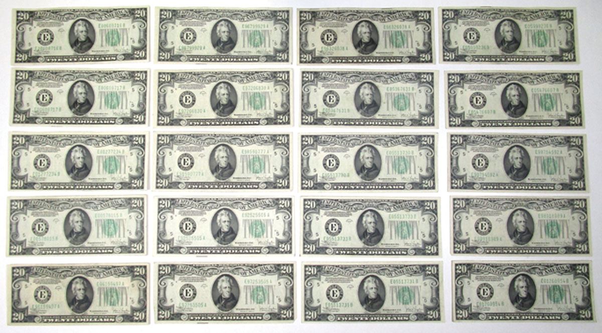 Richmond…...., Virginia, 1934. $20, Series of 1934C, Fr.# 2057E, Issued Group of 20 Federal Reserve Notes, Green seal at right, Julian | Snyder Signatures, Condition ranges from XF to AU condition. (U.S. Face Value is $400), (20).