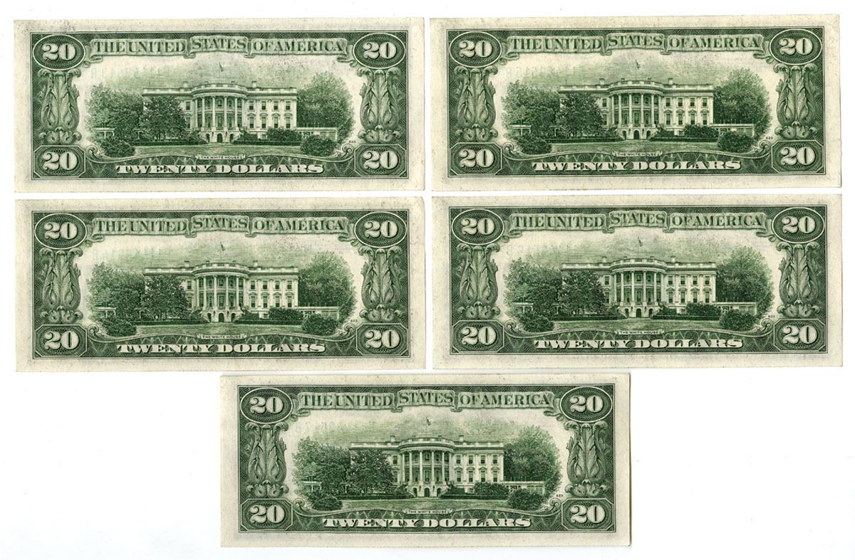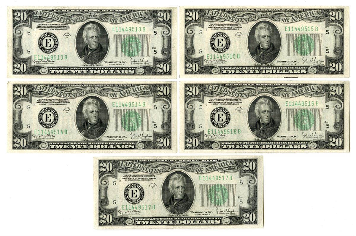Richmond, Virginia District, 1934. $20, Series of 1934D, Fr.# 2058E, Sequential Group of 5 Federal Reserve Notes, Green seal at right, Clarke | Snyder Signatures, S/Ns E11449513B to E11449517B, Condition ranges from AU to Choice AU or better condition. (U.S. Face Value of $100), (5).