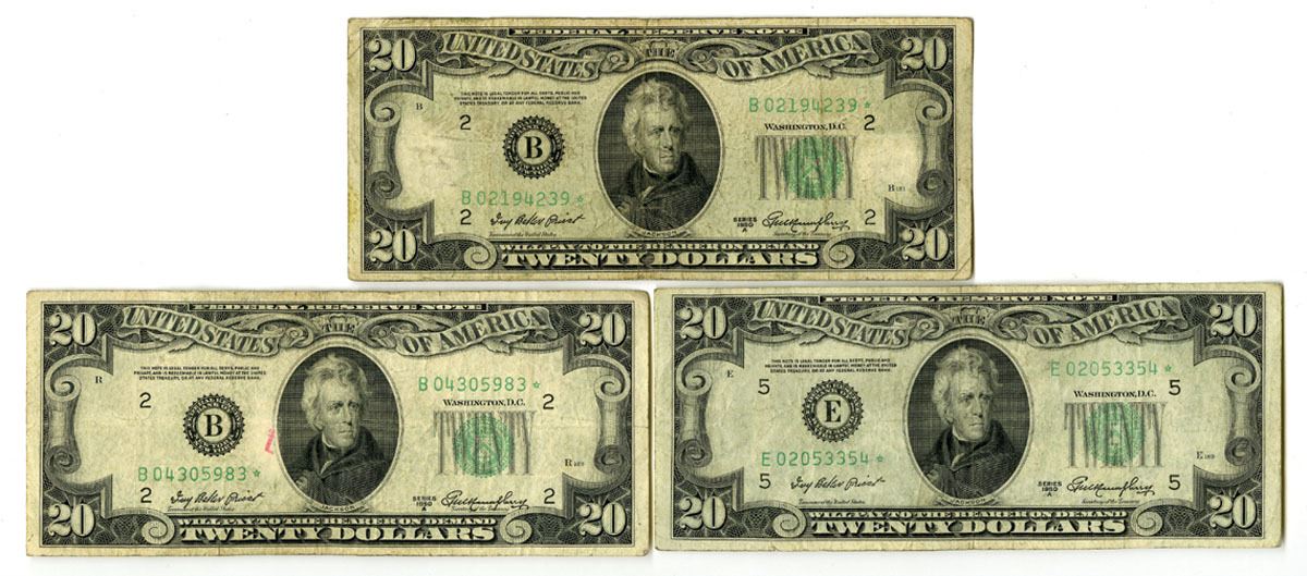 Various States, 1950. Lot of 3, $20, Series of 1950A, Issued Replacement or Star Notes from New York NY, Fr.# 2011B* (2); Richmond VA, Fr.# 2011E*. All have Priest | Humphrey Signatures and Green seal at right, Notes range from Choice Fine to VF+ condition. (3).