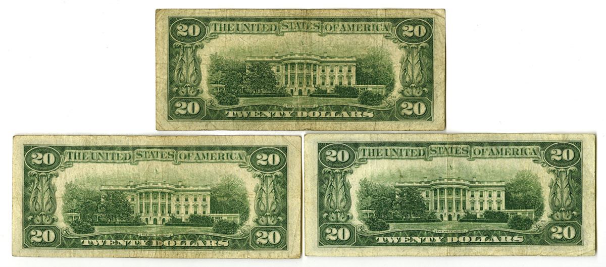 Various States, 1950. Lot of 3, $20, Series of 1950A, Issued Replacement or Star Notes from New York NY, Fr.# 2011B* (2); Richmond VA, Fr.# 2011E*. All have Priest | Humphrey Signatures and Green seal at right, Notes range from Choice Fine to VF+ condition. (3).