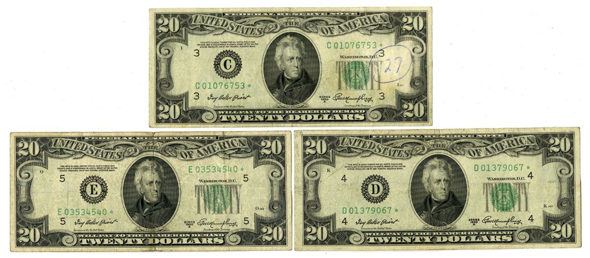 Various States, 1950. Lot of 3, $20, Series of 1950A, Issued Replacement or Star Notes from Philadelphia PA, Fr.# 2011C*; Cleveland OH, Fr.# 2011D*; Richmond VA, Fr.# 2011E*. All have Priest | Humphrey Signatures and Green seal at right, Notes range from Choice Fine to VF+ condition. (3).