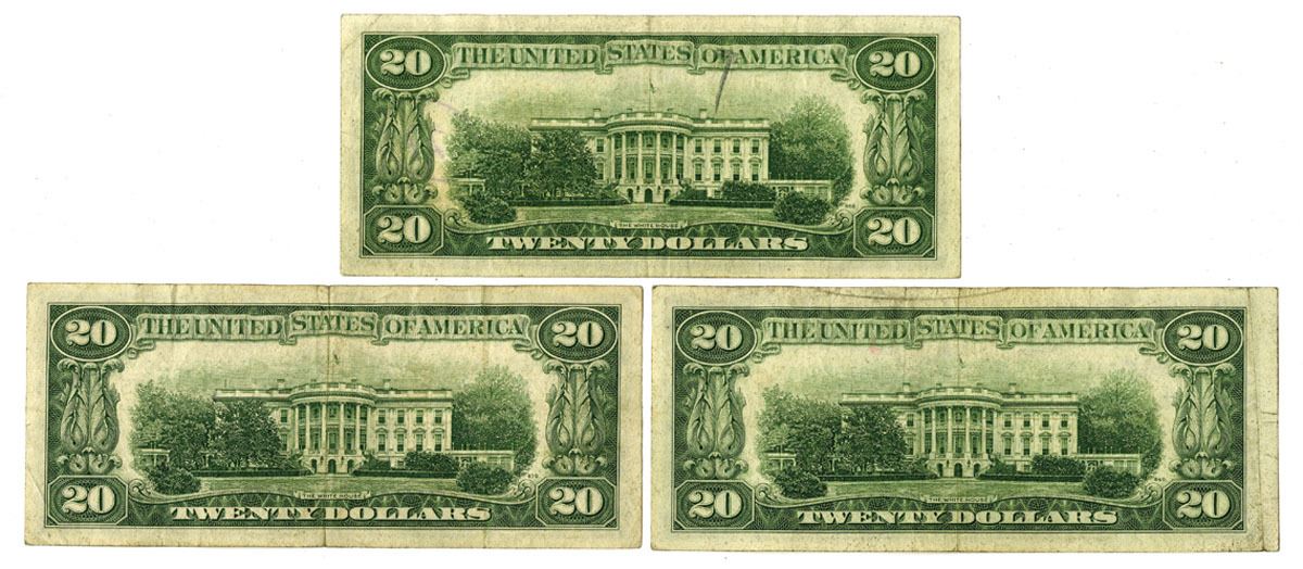 Various States, 1950. Lot of 3, $20, Series of 1950A, Issued Replacement or Star Notes from Philadelphia PA, Fr.# 2011C*; Cleveland OH, Fr.# 2011D*; Richmond VA, Fr.# 2011E*. All have Priest | Humphrey Signatures and Green seal at right, Notes range from Choice Fine to VF+ condition. (3).