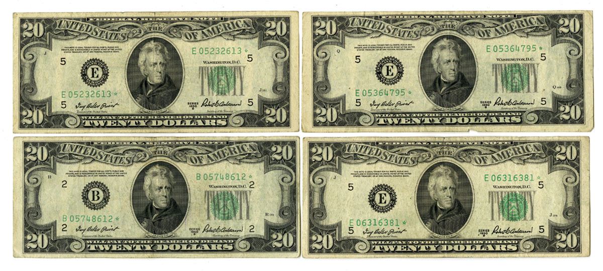 Various States, 1950. $20, Series of 1950B, Fr.# 2061*, Group of 4 Federal Reserve Replacement or Star Notes, Green seal at right, Priest | Anderson signatures, Notes range from VF to Choice VF condition. (4).