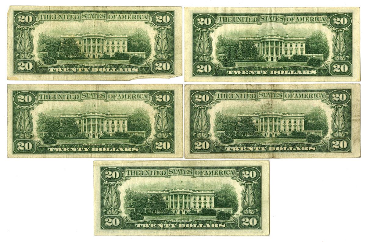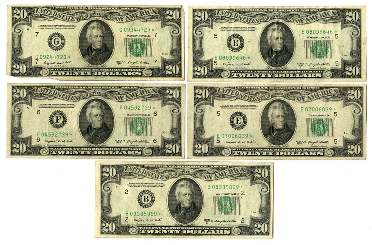 Various States, 1950. $20, Series of 1950C, Fr.# 2062*, Group of 5 Federal Reserve Replacement or Star Notes, Green seal at right, Smith | Dillon signatures, Notes range from Choice VF to Choice VF condition. (5).