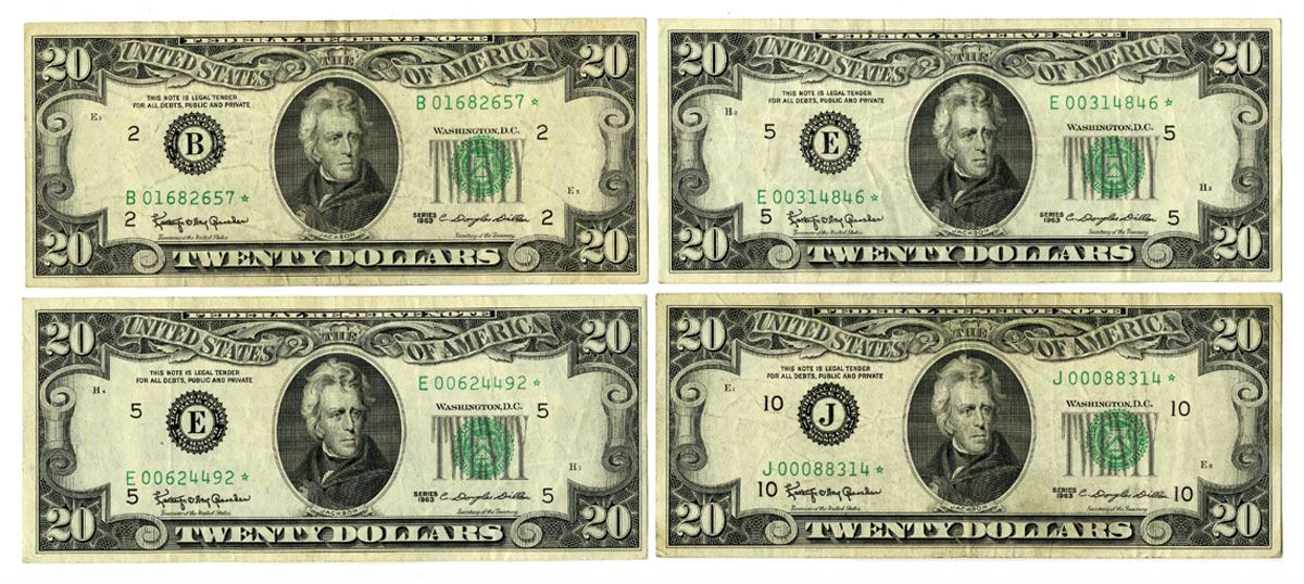 Various States, 1963. Lot of 4 $20 Series of 1963 Banknotes from Various Districts, Includes: New York NY, Fr.# 2065B*; Richmond VA, Fr.# 2065E* (2); Kansas City MO, Fr.# 2065J*. All have Granahan | Dillon Signatures and Green seal at right, Notes range from VF to Choice VF condition. (6).