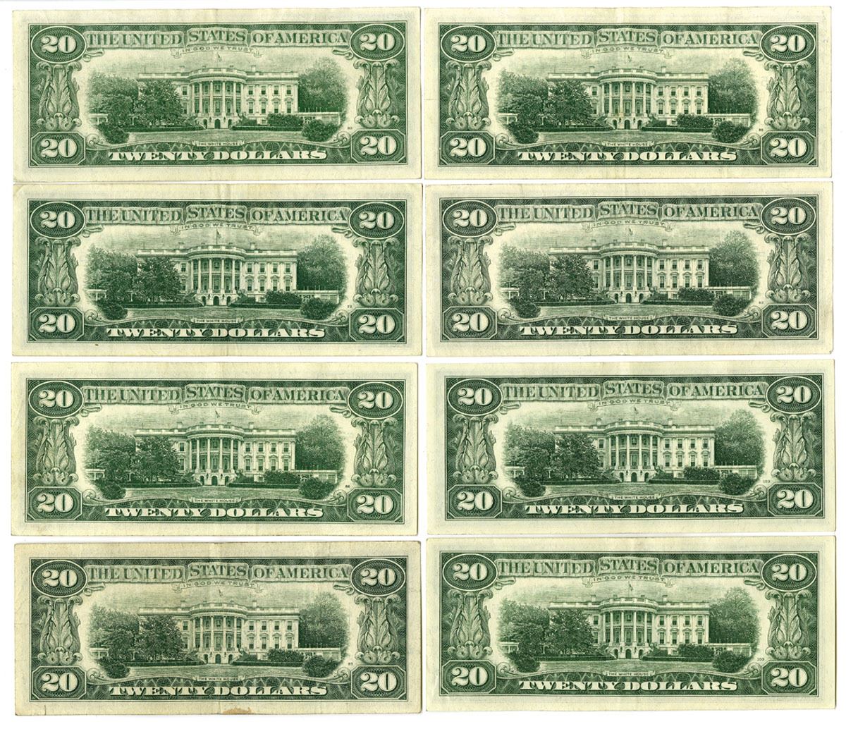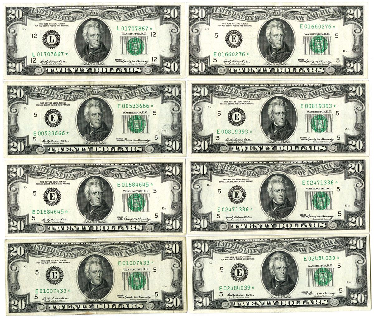 Various States, 1969. $20, Series of 1969, Fr.# 2067*, Group of 8 Federal Reserve Replacement or Star Notes, Green seal at right, Slater | Kennedy signatures, Notes range from XF to AU condition. (U.S. Face Value is $160), (8).