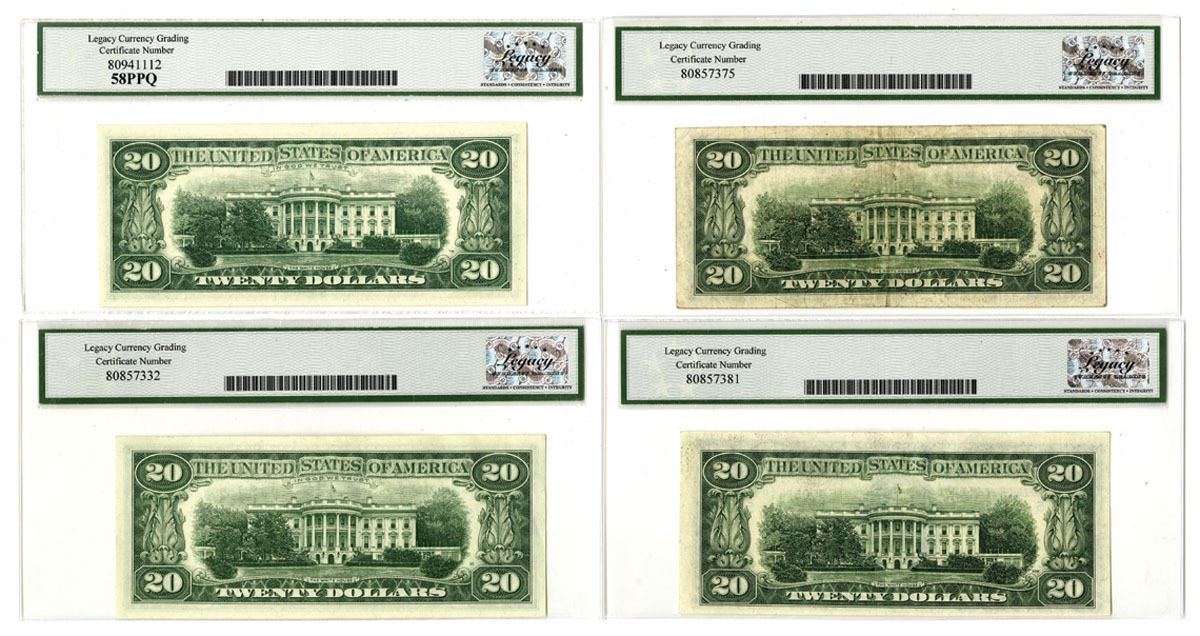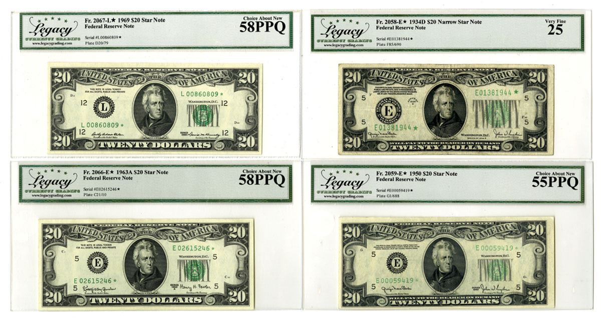 Washington D.C., 1934 to 1969. Lot of 4 Issued Replacement Banknotes, all but the Series of 1969 are from the Richmond, Virginia F.R.N. Branch, Includes Series of 1934D, $20, Fr.# 2058-E*, Narrow Star Note, green seal at right, S/N E01381944*, Legacy graded Very Fine 25; Series of 1950, $20, Fr.# 2059-E*, Star Note, Legacy graded Choice About New 55PPQ; Series of 1963A, $20, Fr.# 2066-E8, Star Note, Legacy graded Choice About New 58PPQ; Series of 1969, $20, Fr.# 2067-L*, Star Note, Legacy graded Choice About New 58PPQ. (4). Sold "AS IS" no returns accepted.