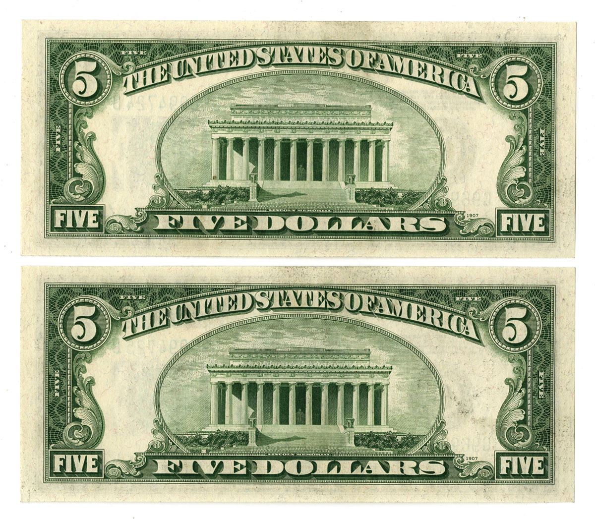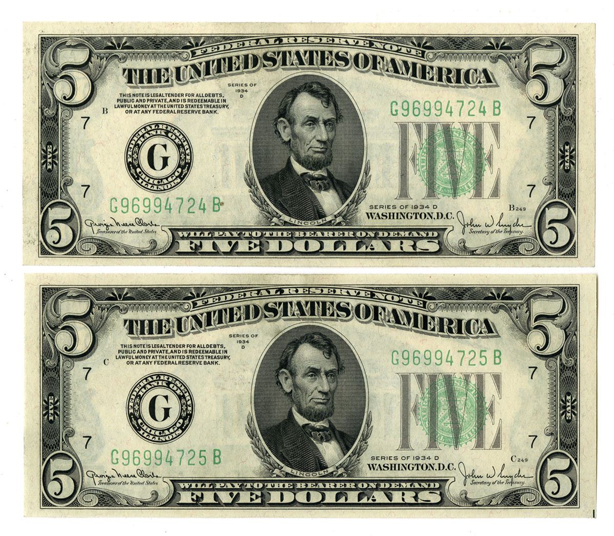 Chicago, Illinois., 1934. $5, Series of 1934D, Fr.1960G, Sequential Issued Banknote Pair, Clark | Snyder Signatures, Small green seals at right, S/Ns G96994724B and G96994725B, Notes are in Unc to Choice Unc or better condition. (2).