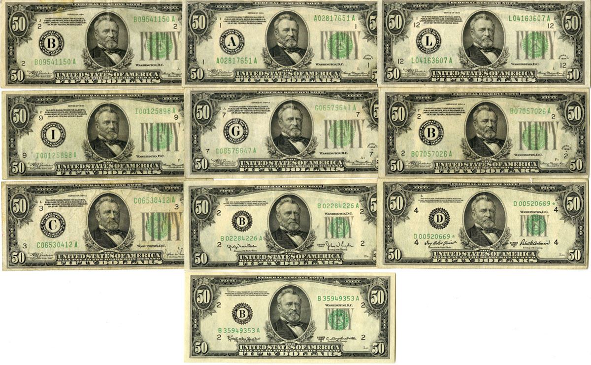 Various States, 1928 to 1934. Lot of 10 $50 Federal Reserve Notes, Includes: Series of 1934, $50, Fr.# 2102 (4), Julian | Morgenthau Signatures; Series of 1934A, $10, Fr.# 2103 (2), Julian | Morgenthau Signatures; Series of 1934C, $50, Fr.# 2105, Julian | Snyder Signatures; Series of 1950, $50, Fr.# 2107, Clarke | Snyder Signatures; Series 1950B, $50, Fr.# 2109*, Priest | Anderson Signatures; Series 1950D, $50, Fr.# 2111, Granahan | Dillon Signatures. Notes range from Choice VF to XF condition or better. (U.S. Face Value is $500), (10).