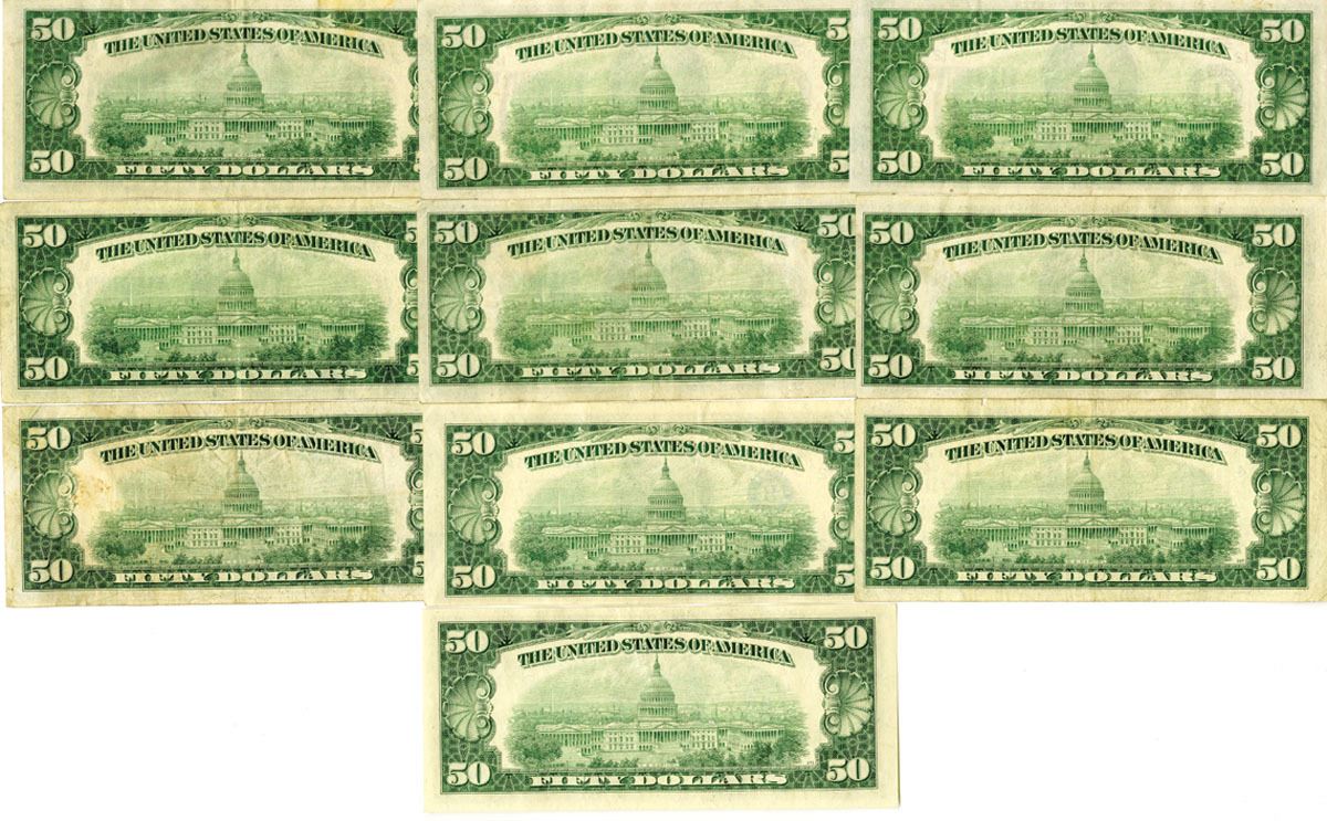 Various States, 1928 to 1934. Lot of 10 $50 Federal Reserve Notes, Includes: Series of 1934, $50, Fr.# 2102 (4), Julian | Morgenthau Signatures; Series of 1934A, $10, Fr.# 2103 (2), Julian | Morgenthau Signatures; Series of 1934C, $50, Fr.# 2105, Julian | Snyder Signatures; Series of 1950, $50, Fr.# 2107, Clarke | Snyder Signatures; Series 1950B, $50, Fr.# 2109*, Priest | Anderson Signatures; Series 1950D, $50, Fr.# 2111, Granahan | Dillon Signatures. Notes range from Choice VF to XF condition or better. (U.S. Face Value is $500), (10).