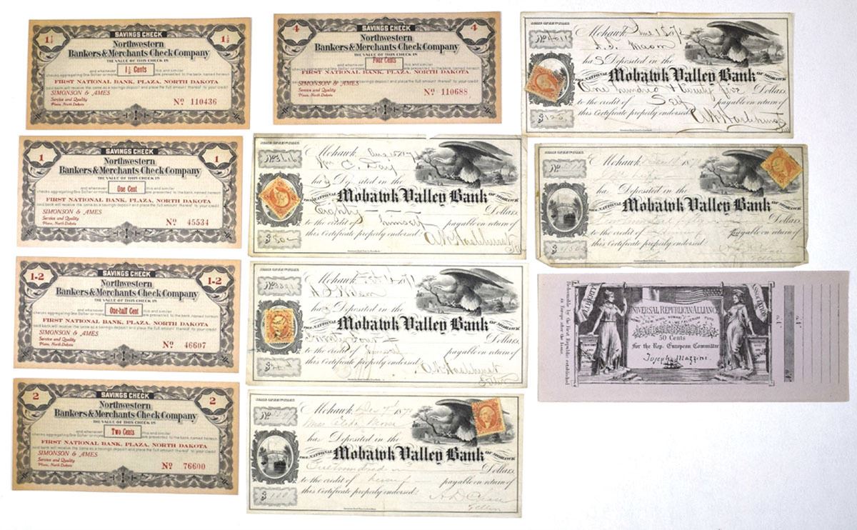 Lot of 11 Subscription Certificate, Savings Checks & Revenue-Stamped Drafts, Includes: Universal Republican Alliance, ND (ca.1850s), Subscription Certificate; Northwestern Bankers & Merchants Check Co., ND (1920s), 50 Cents, 1 Cent, 1.5 Cents, 2 Cents, and 4 Cents Savings Checks (5); National Mohawk Valley Bank. 1872 I/C Drafts With I.R. RN-C1 (5). Items range from VF to CU condition. (11). Sold "AS IS" no returns accepted.