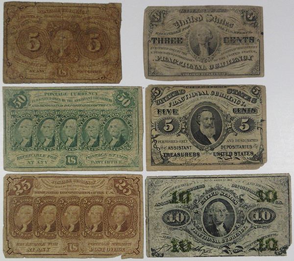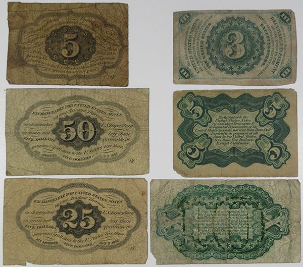 Lot includes from the First Issue, 5 Cents, P-97; 25 Cents, P-99; and 50 Cents, P-100; and from the Third Issue 3 Cents, P-105; 5 Cents, P-106; and 10 Cents, P-107. Generally Good to Choice VG.
