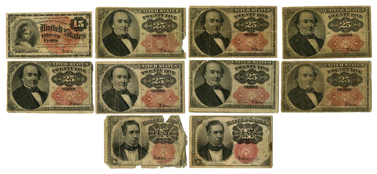 Washington D.C., 1863. Lot of 10 Fractional Currency Issued Banknotes, Includes: 15 Cents, P-116b Fr.# 1268, Fourth Issue, NBNC; 10 Cents, P-122b (2) Fr.# 1265, Fifth Issue, BEP; 25 Cents, P-123a Fr.# 1308 and P-123b (6) Fr.#1309, Fifth Issue, BEP. Notes range from Good to VF+ condition. (10). Sold "AS IS" no returns accepted.