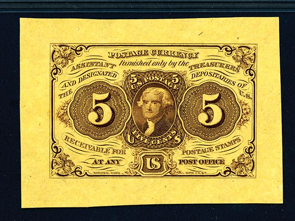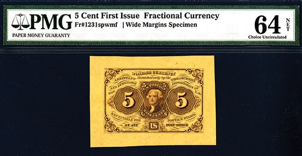 U.S. Fractional Currency, First Issue, 5 Cents, Uniface Wide Margin Front Specimen, Fr.1231spwmf. 5 Cents, wide margin. PMG graded. Choice Uncirculated 64 NET. "Trimmed."
