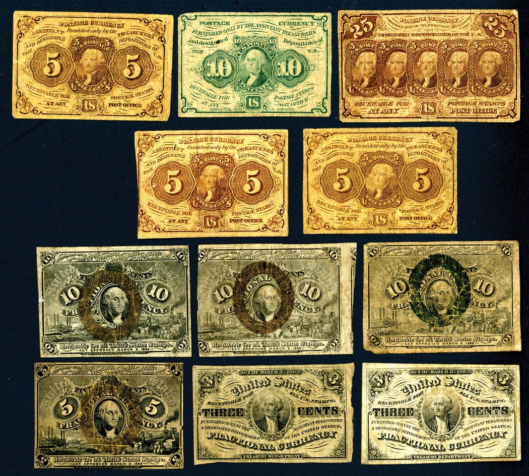 Lot of 11 Fractional notes. Includes 1st Issues, 5cts (3), 10 cts and 25 cts, VG to Choice Fine with a few small faults; 2nd issues, 5 cts (1), 10 cts (3); and 3rd Issues, 3 cts (2). Various grades, observation is suggested. Sold "AS IS".