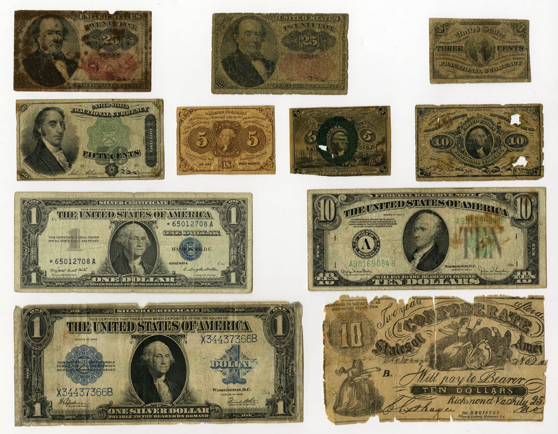 Lot of 11 Issued Banknotes, Includes: a variety of Fractional Currency types; $1 Silver Certificate Series of 1923; $1 Silver Certificate Series of 1957, Replacement; $10 Silver Certificate Series of 1934 D; and a partial damaged contemporary counterfeit Confederate States of America type of $10, P-9 SL#9, H&L. Notes range from VG with damage to VF condition. (11). Sold "AS IS" no returns accepted.