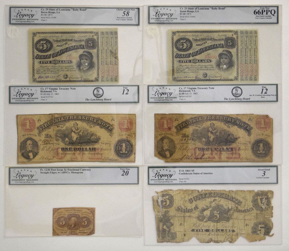 Various States, 1861-75. Lot of 5 Issued Banknotes, Includes: 1861, Confederate States of America, $5, T-11, S/N 5202 p Bb, Legacy graded About Good 3 'Cut-Out Cancelled' with comment "Splits, Tears, and Damage: Partially Backed;" 1862, Fractional Currency, 5 Cents, First Issue, Fr.# 1230, Legacy graded Very Fine 20 with comments "Bottom Edge Unevenly Trimmed; Missing LR Corner;' 1862, Virginia Treasury Note, $1 Cr.17 (2), S/Ns 127742 pp A and 143767 pp A, Both Legacy graded Fine 12 - Both with comments one says "Splits and Tears; Old Repair on Back" and other "Missing UR and LL Corners; Small Stains; Small Hole near Center;" 1875, State of Louisiana, $5 Baby Bonds (2), S/N 622-53089 pp C & 622-53090 pp C, Both Legacy graded: First is Choice About New 58'Hole Punch Cancelled - Four Coupons Attached' with comment "Edge Tear and Stain in Coupons at Right" other is graded Gem New 66 PPQ ' Hole Punch Cancelled - Four Coupons Attached'" (5). Sold "AS IS" no returns accepted.