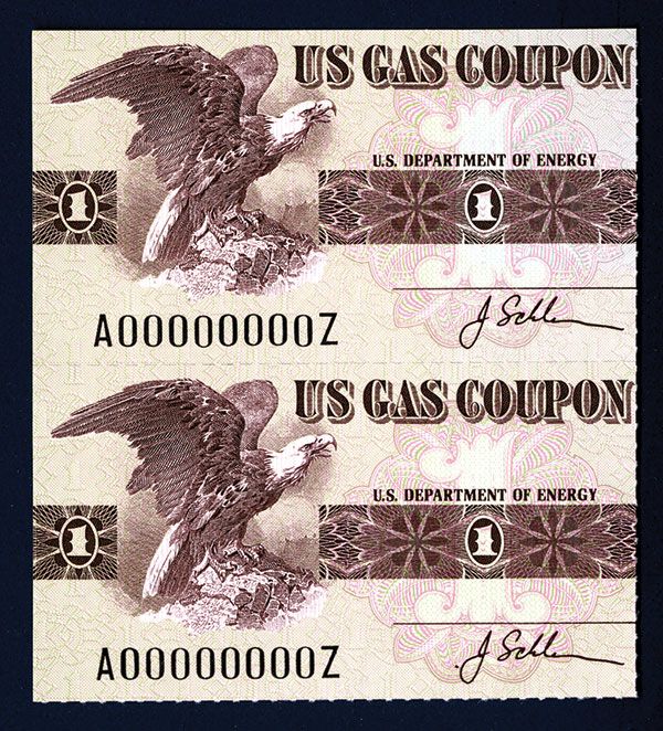 U.S., Uncut pair of U.S. Gas Coupon Essays printed in brown on m/c with Screaming Eagle vignette, S/N A00000000Z, evidently an essay design by ABNC for potential gas rationing due to the middle east turmoil and OPEC in the early 1970's. ABNC.