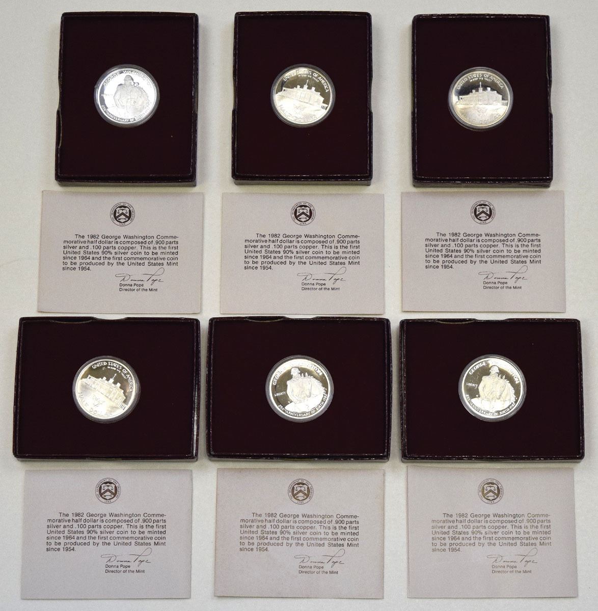 U.S., 1982. Lot of 6 Silver Commemorative Half Dollars issued for the 250th Anniversary of the Birth of George Washington, each housed in its original U.S. Mint presentation case. Coins are struck in .900 fine silver, each weighing 26.73 grams (0.4019 troy oz) with a 30.6 mm diameter. ASW 0.3617 troy oz per coin, totaling 2.17 troy oz of .999 silver with a silver melt of $173 with silver at $80 ounce. Produced by the United States Mint. (6). Sold “AS IS” no returns accepted.