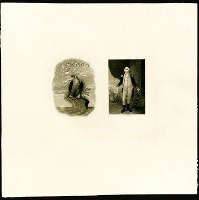 ca.1880's-1920's. Proof of standing George Washington portrait onright and Eagle with "The Constitution" title over it. Both have "Sartain Sc" imprints on bottom with no other markings. Printed on thin card stock. XF condition.