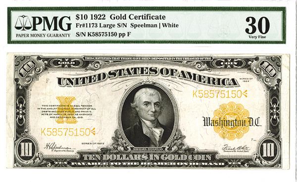 U.S. Gold Certificate, $10, Series of 1922, PMG Graded Very Fine 30, S/N K58575150 pp F.