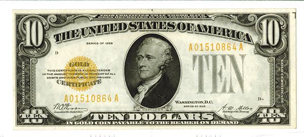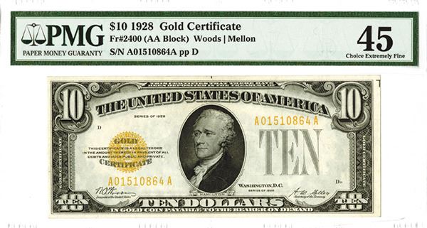 U.S. Gold Certificate, $10, Series of 1928, PMG Graded Choice Extremely Fine 45, S/N A01510864A pp D