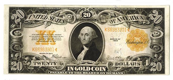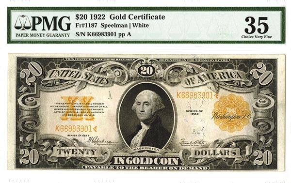 U.S. Gold Certificate, $20, Series of 1922, PMG Choice Very Fine 35, S/N K66983901 pp A.