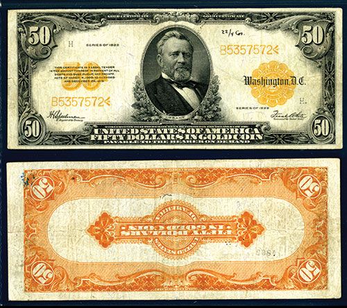 U.S., 1922, $50 Gold Note, Fr#1200, Large S/N B5357572, PMG graded Very Fine 25, Speelman | White signatures, pp H, attractive note with small ink notation on top right near border, otherwise well centered, firm paper, large margins and sharp corners only add to the desirability of this lovely note.