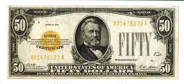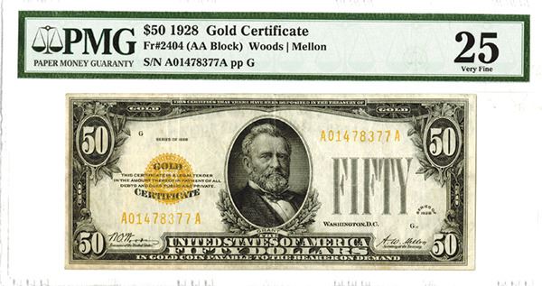 U.S. Gold Certificate, $50, Series of 1928, PMG Graded Very Fine 25, S/N A01478377A pp G.