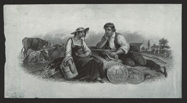 ND (ca,1852), $1 Gold coin showing the front and back in scene with young couple holding rake and milk bucket with farm and cows in background, 3. by 2 inches, Uncirculated. Vignette used on obsolete banknotes, checks, drafts and documents, RWH&E.