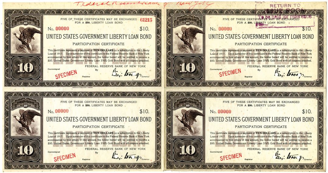 New York and Washington, D.C., 1917. Federal Reserve Bank of New York. Uncut Block of 4 Specimen Certificates, $10 Specimen United States Government Liberty Loan Bond, Participation Certificate. Text on bond states: Five of these certificates may be exchanged for a $50 Liberty Loan Bond. "This certificate represents a payment of $10 on a subscription to the Liberty Loan of 1917. Upon surrender of this certificate to the Federal Reserve Bank of New York accompanied by four others of like amount, the holder hereof will be entitled to receive a $50. United States Liberty Loan 3 1/2% Gold Bond with all coupons attached". "Federal Reserve Bank of New York". Red specimen overprint, POC and "00000" serial numbers. Screaming Eagle at left. Red ink notation on top excess margin " Federal Reserve of New York" and purple handstamp "Return to Issue Room - To Be Held for reference", AU Condition. Rare Liberty Bond related item. ABNC.
