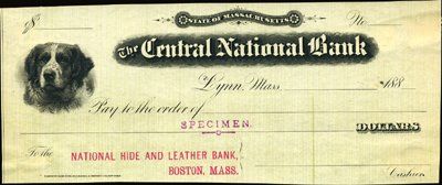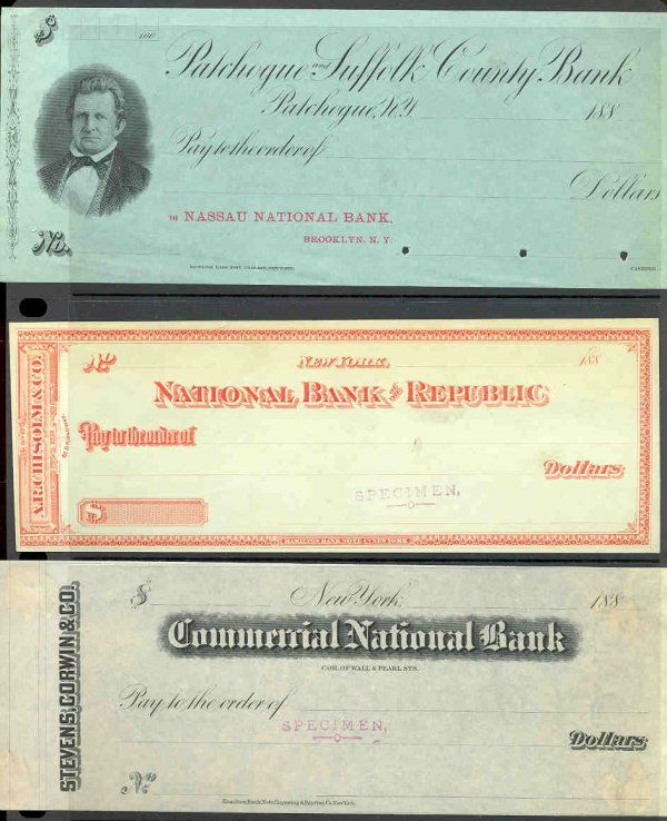 188- (ca.1880's). 4 different specimen checks from amazing HBNC sample book. Checks include Patchogue and Suffolk County Bank, Patchogue, NY, with vignette of notable on left; National Bank of the Republic, New York, NY, fancy borders; Commercial National Bank, Cor.Wall & Pearl Streets, NY, NY, fancy title; and, The Central National Bank, Lynn, MA, with vignette of St.Bernard on left. All with purple specimen overprints. All unique in archive. HBNC.