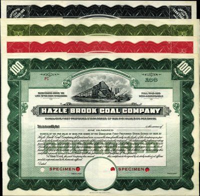 ca.1910-30's. 7 different coal mining specimens from the same company with different colors and share amounts. XF condition. Scarce and attractive coal mining group. SBNC.